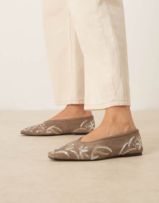 ASOS DESIGN – Lupin – Ballerinas in Olivgrün mit hochwertiger Stickerei und kantiger Zehenpartie