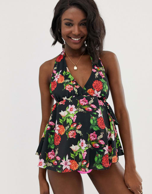 ASOS DESIGN Maternity – Bikiniset mit Tankinioberteil und Hüfthose in Rosa mit neonfarbenem Blumenmuster