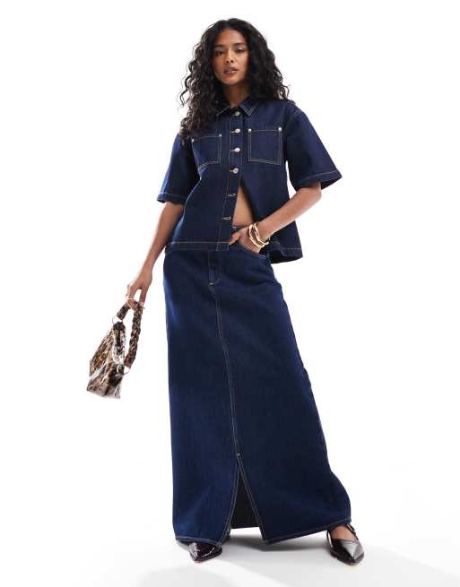 ASOS DESIGN – Maxi-Jeansrock in Indigoblau mit Schlitz vorne