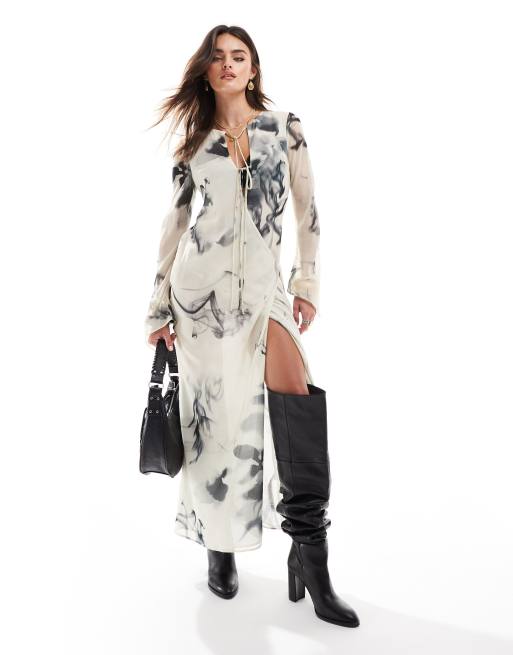 ASOS DESIGN – Maxi-Wickelkleid in Elfenbein mit Tintendruck und Schnürung