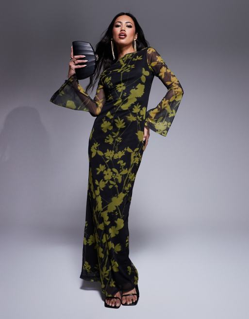 ASOS Design – Maxikleid aus Netzstoff in Grün und Schwarz mit tiefem Rückenausschnitt und Trompetenärmeln
