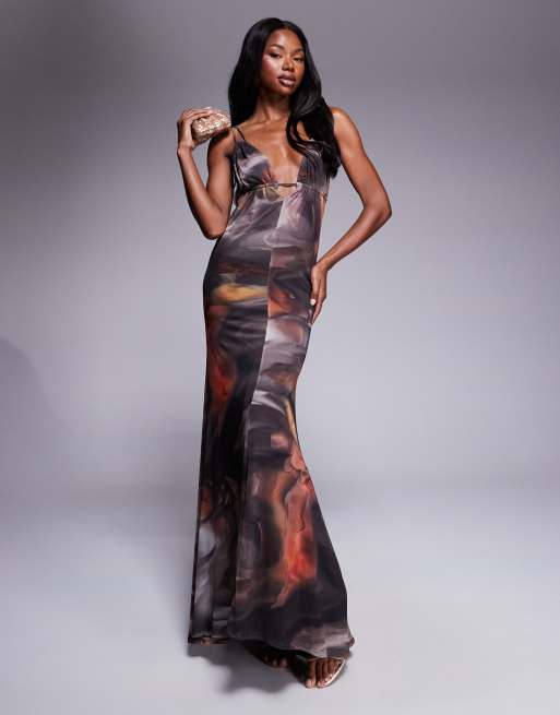 ASOS DESIGN – Maxikleid aus Netzstoff mit tiefem Ausschnitt, Doppelträgern und Wirbelmuster