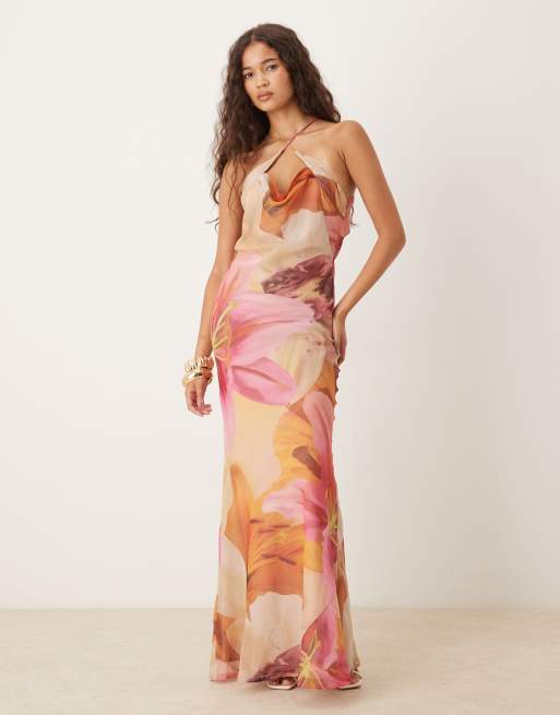 ASOS DESIGN – Maxikleid aus Satin und Chiffon mit großem Blumenprint und Wasserfallausschnitt