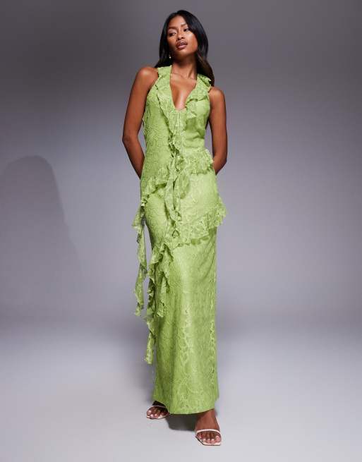ASOS DESIGN – Maxikleid aus Spitze in Olivgrün mit tiefem Ausschnitt und Rüschen