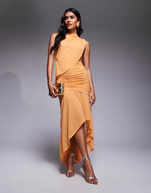 ASOS DESIGN – Maxikleid in Apricot mit Raffung und hinten längerem Saum