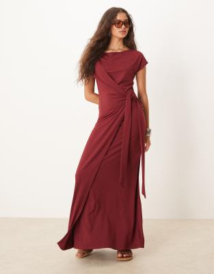 ASOS DESIGN – Maxikleid in Burgunderrot mit Flügelärmeln und Wickelfront mit Bindedetail
