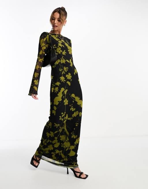 ASOS DESIGN – Maxikleid in Grün und Schwarz aus Netzstoff mit Print, tiefem Rückenausschnitt und Trompetenärmeln