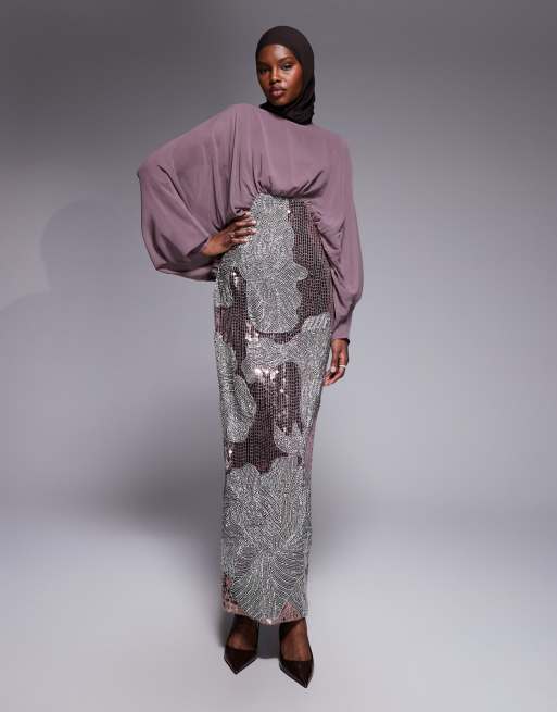 ASOS DESIGN – Maxikleid in Malve mit Blouson-Oberteil, Fledermausärmeln und Blumenverzierung am Rock