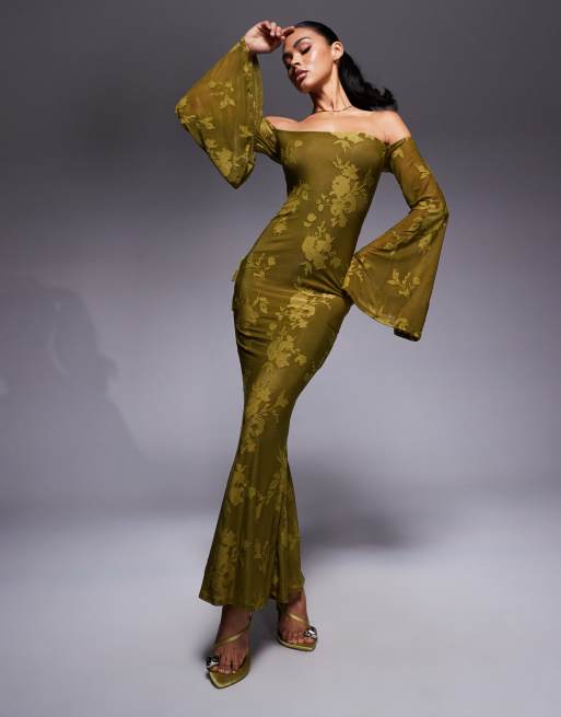 ASOS DESIGN – Maxikleid in Olivgrün mit Carmen-Ausschnitt, Flügelärmeln udn Zierschleife am Rücken