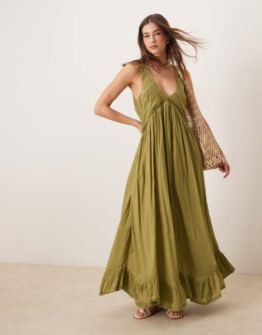 ASOS DESIGN – Maxikleid in Olivgrün mit Zipfelsaum und U-Ausschnitt