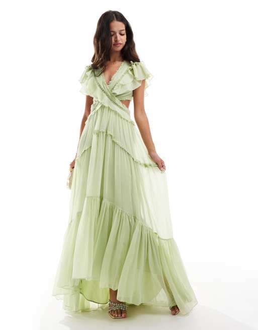 ASOS DESIGN – Maxikleid in Salbeigrün mit Wickeloptik, Flatterärmeln und Spitzenbesatz