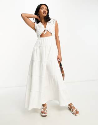 ASOS DESIGN – Maxikleid in Weiß mit gehäkeltem Oberteil und gestuftem Rock