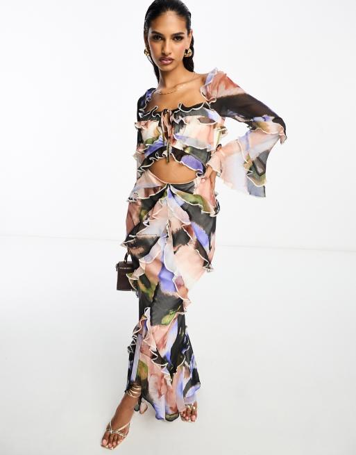 ASOS DESIGN – Maxikleid mit Milchmädchen-Ausschnitt, Rüschen, Zierausschnitt, ausgestellten Ärmeln und Aquarellmuster