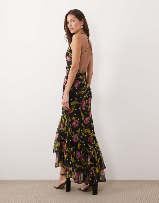 ASOS DESIGN – Maxikleid mit Riemchenträgern, Schwalbenschwanzrock, Rüschen und dunklem Blumenmuster