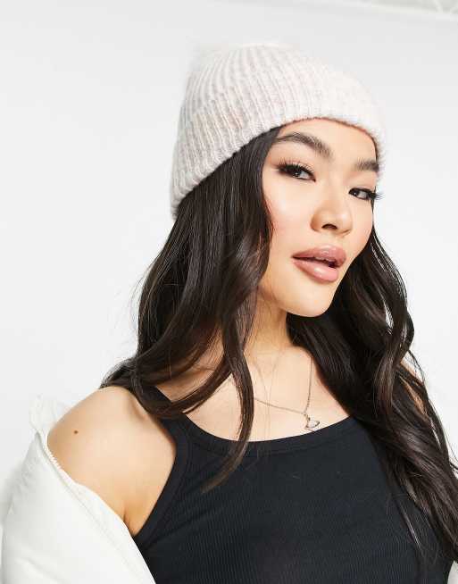 ASOS DESIGN – Mehrfarbige, gerippte Strickmütze mit cremeweißem Kunstpelz-Bommel