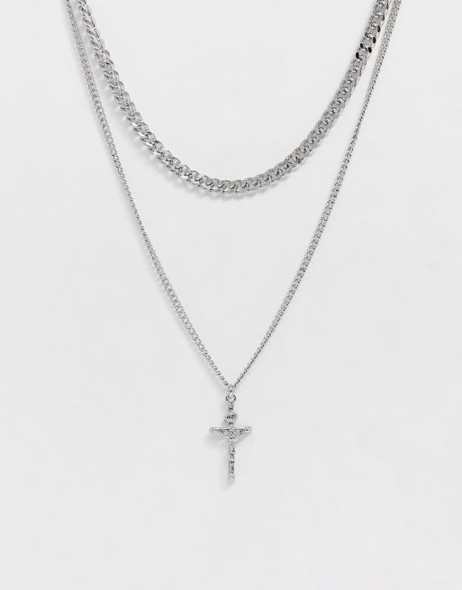ASOS DESIGN – Mehrlagige, silberfarbene Halskette mit Kreuzanhänger