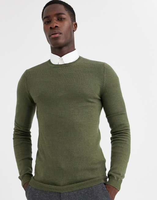 ASOS DESIGN – Merino-Wollpullover in Muscle Fit in Khaki