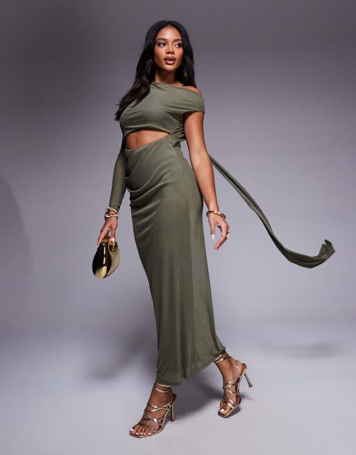 ASOS DESIGN – Midaxi-Kleid in Khaki mit einem Ärmel, Rückenausschnitt, Schärpendetail und Netzstoffeinsätzen