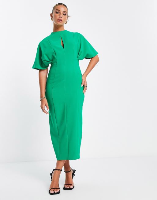 ASOS DESIGN – Midi-Etuikleid in Knallgrün mit Engelsärmeln und Schlüsselloch-Detail vorn