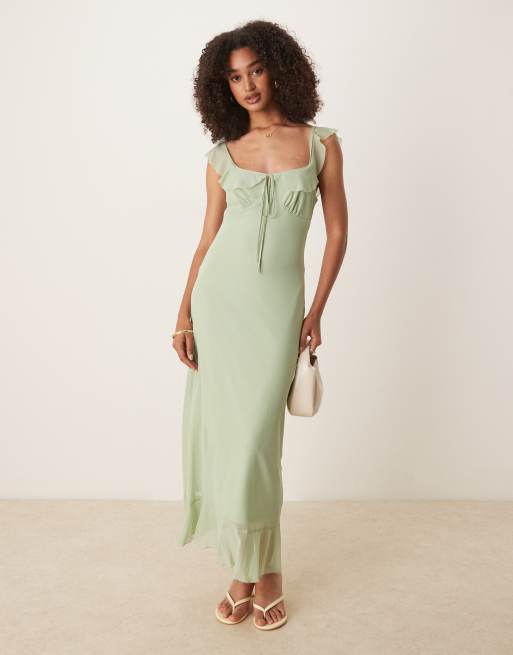 ASOS DESIGN – Midi-Freizeitkleid aus salbeigrünem Netzstoff mit doppelten Rüschen