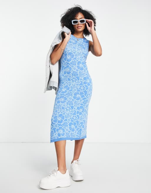 ASOS DESIGN – Midi-Strickkleid in Blau mit floralem Muster