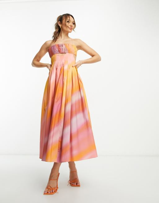 ASOS DESIGN – Midikleid aus strukturierter Baumwolle in Orange mit Aquarellprint, gerafftem Dekolleté und Faltenrock