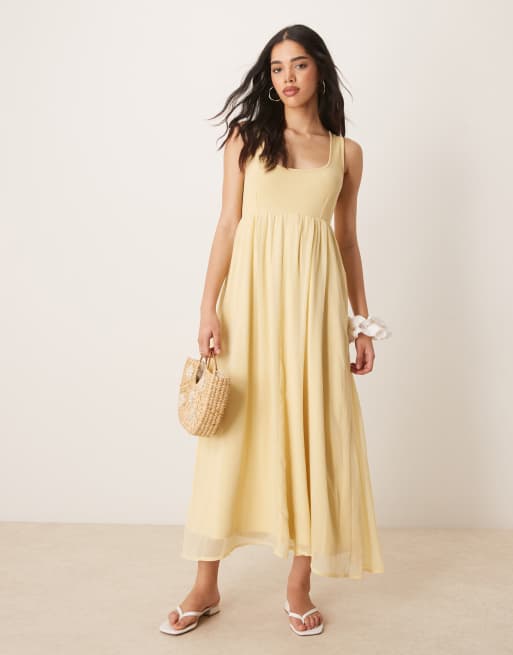 ASOS DESIGN – Midikleid in Gelb mit Chiffonrock und fein gerippter Brustpartie