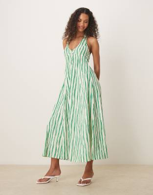 ASOS DESIGN – Midikleid in Grün gestreift mit Neckholder und Godet-Saum