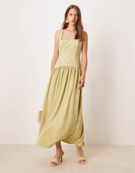 ASOS DESIGN – Midikleid in Olivgrün mit eckigem Ausschnitt und tiefer Taille