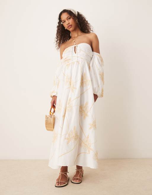 ASOS DESIGN – Midikleid in Weiß mit Blumenstickerei und Bardot-Ausschnitt