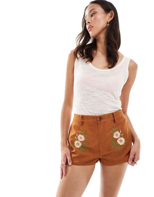 ASOS DESIGN – Mikro-Shorts aus Wildlederimitat in Hellbraun mit Stickerei