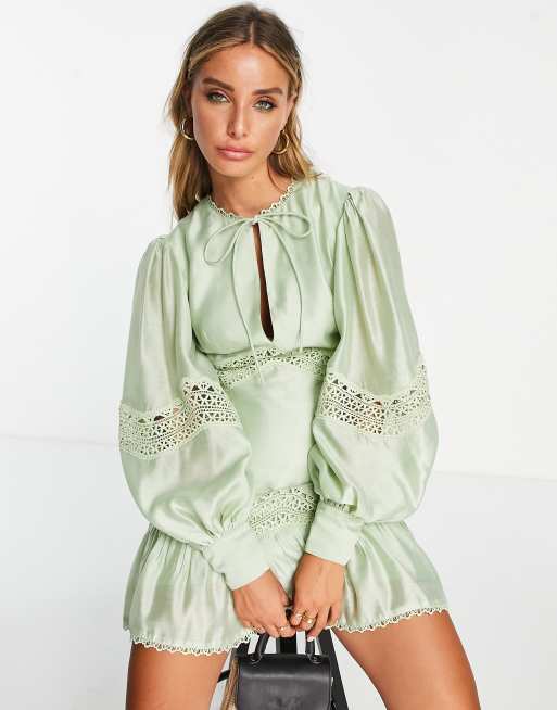ASOS DESIGN – Mini-Freizeitkleid in Salbeigrün mit Spitzeneinsatz und Schlüssellochausschnitt vorne