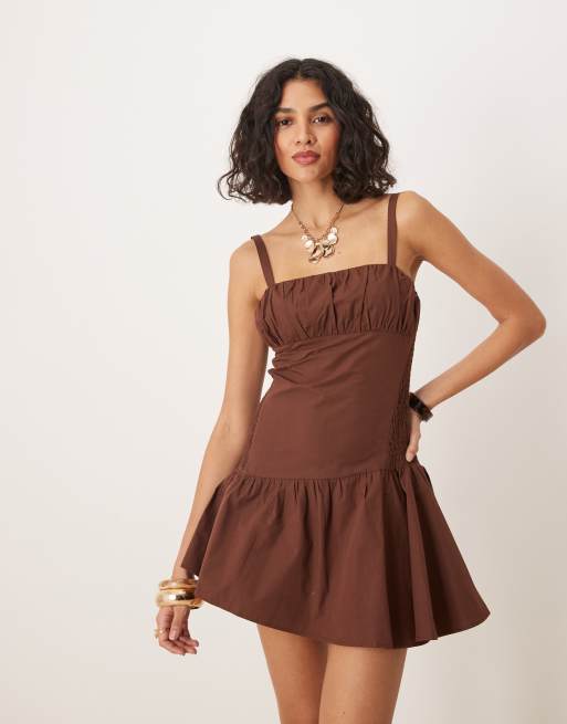 ASOS DESIGN – Mini-Trägerkleid in Schokobraun mit gesmoktem Oberteil
