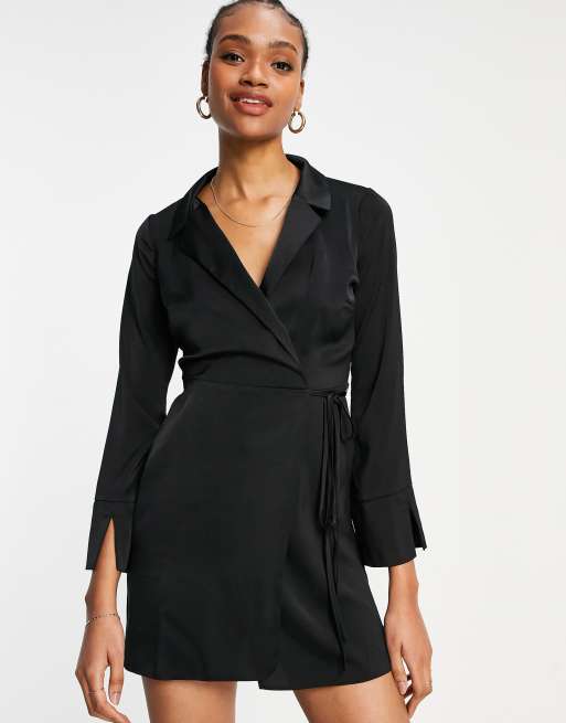 ASOS DESIGN – Mini-Wickelkleid aus Satin mit Kragen und Bindedetail in Schwarz