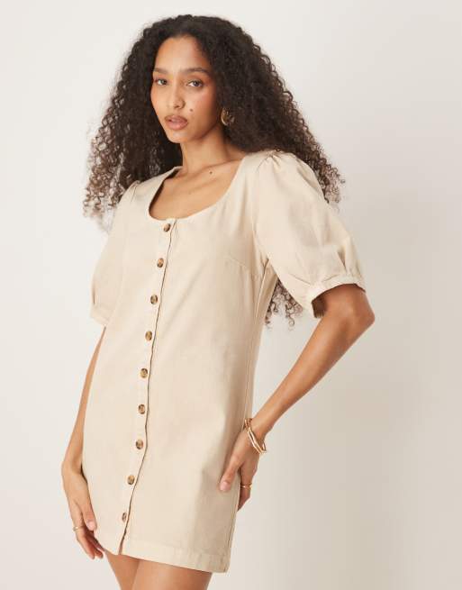 ASOS DESIGN – Minikleid aus Denim in neutraler Farbe mit Knopfleiste und Puffärmeln
