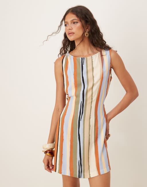 ASOS DESIGN – Minikleid aus Leinenmix mit U-Boot-Ausschnitt und buntem Streifenmuster