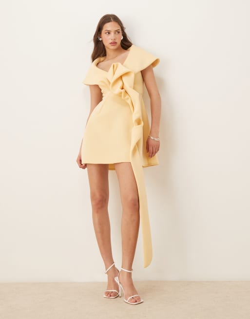 ASOS DESIGN – Minikleid aus Neopren-Material in Buttermilchgelb mit leicht schulterfreiem Design, Front-Detail und A-Linien-Rock
