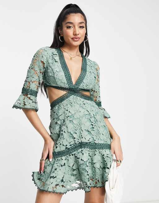 ASOS DESIGN – Minikleid aus Spitze in Salbeigrün mit kreisförmigem Besatz und Zierausschnitten