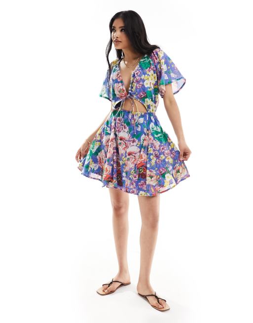 ASOS DESIGN – Minikleid in Blau mit Cut-out, Godetrock und Blumenmuster