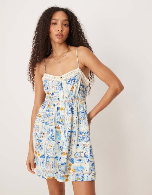 ASOS DESIGN – Minikleid in Blau mit schmalen Trägern, Knopfleiste und Postkartenmuster