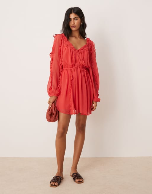 ASOS DESIGN – Minikleid in Rot mit Rüschen, V-Ausschnitt und Bindebändern vorne