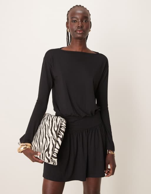 ASOS DESIGN – Minikleid in Schwarz mit elastischer, tief angesetzter Taille und U-Boot-Ausschnitt