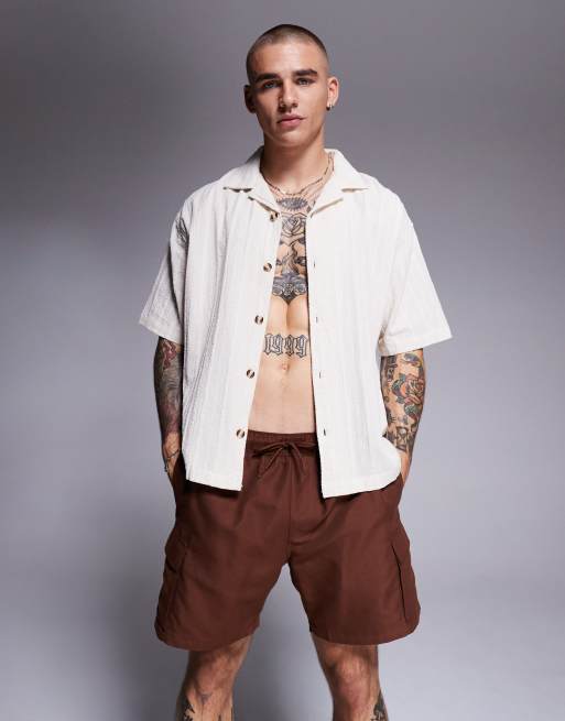 ASOS DESIGN – Mittellange Badeshorts in Dunkelbraun mit Cargotaschen