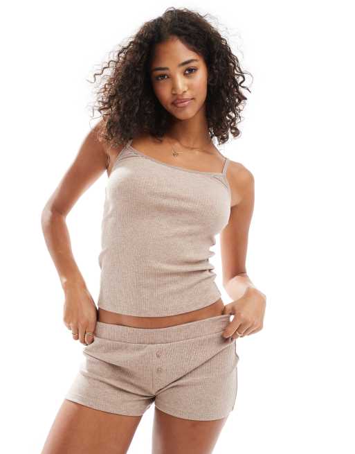 ASOS DESIGN – Mix and Match – Geripptes Camisole-Trägertop in Hellbraun mit Samtbesatz