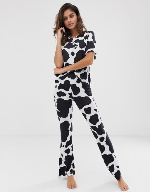 ASOS DESIGN – Mix-and-Match – Pyjamaset mit T-Shirt und Schlaghose mit Kuhmuster