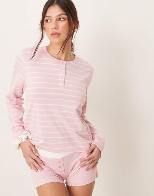 ASOS DESIGN – Mix & Match – Gestreiftes Pyjama-Oberteil mit Henley-Ausschnitt und Scrunchie-Haargummi