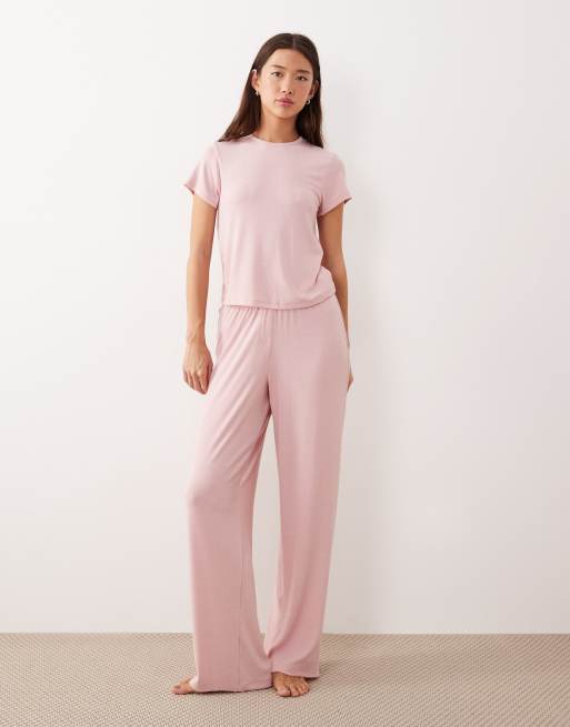 ASOS DESIGN – Mix & Match – Weiche gerippte Pyjamahose in Hellrosa mit weitem Bein