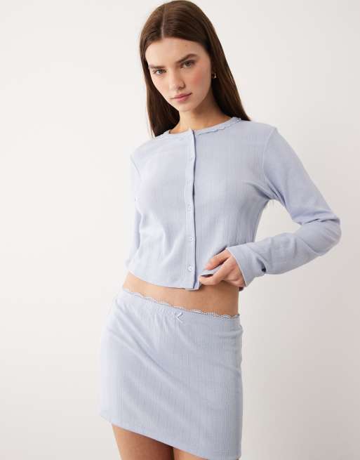 ASOS DESIGN – Nachtwäsche-Strickjacke aus Pointelle in Blau mit Spitzenborte