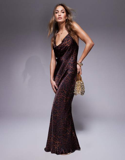 ASOS DESIGN – Neckholder-Maxikleid aus Satin mit Wasserfallausschnitt und Leopardenmuster