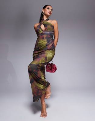 ASOS DESIGN – Neckholder-Maxikleid mit Blumenmuster in Dunkelgrün und Rosa und überkreuzter Vorderseite